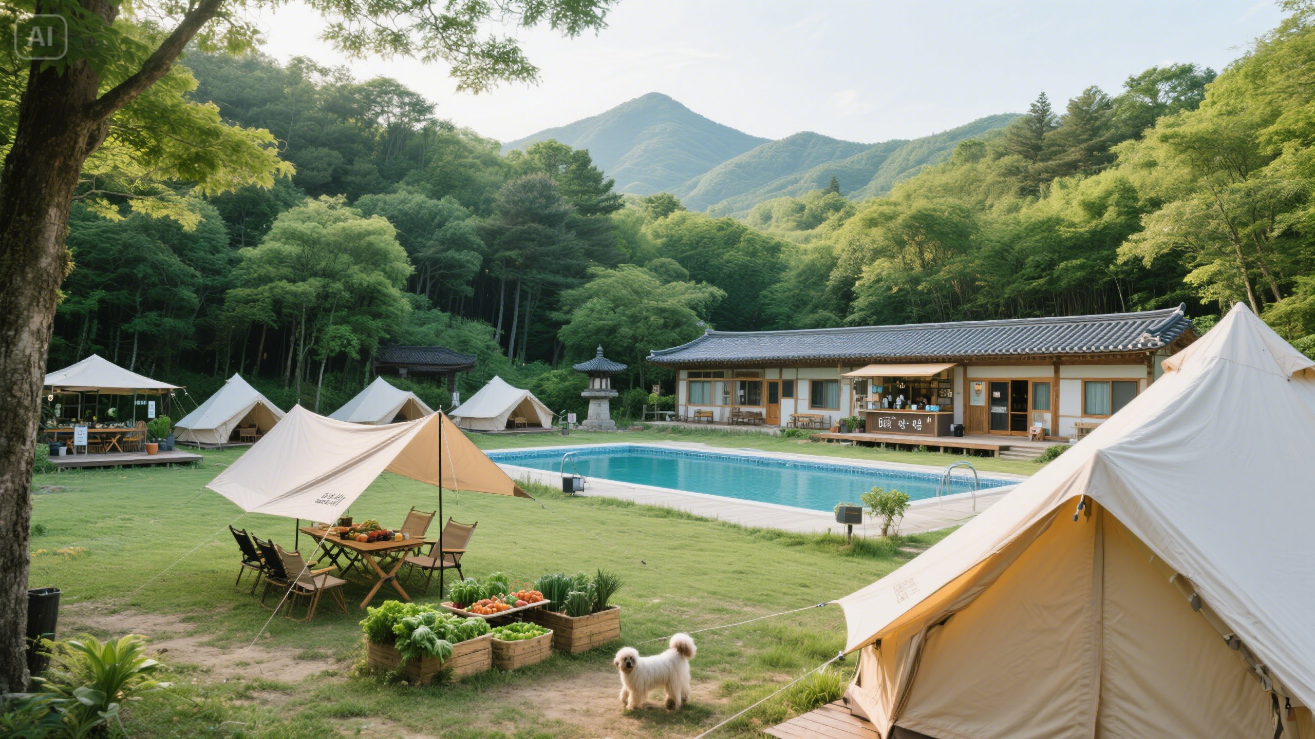 - 시설/편의시설: 펜션 6실, 글램핑, 수영장, 카페, 매점, 샤워장, 화장실, 개수대, 유기농 야채 제공, 반려견(소형견) 동반 가능.