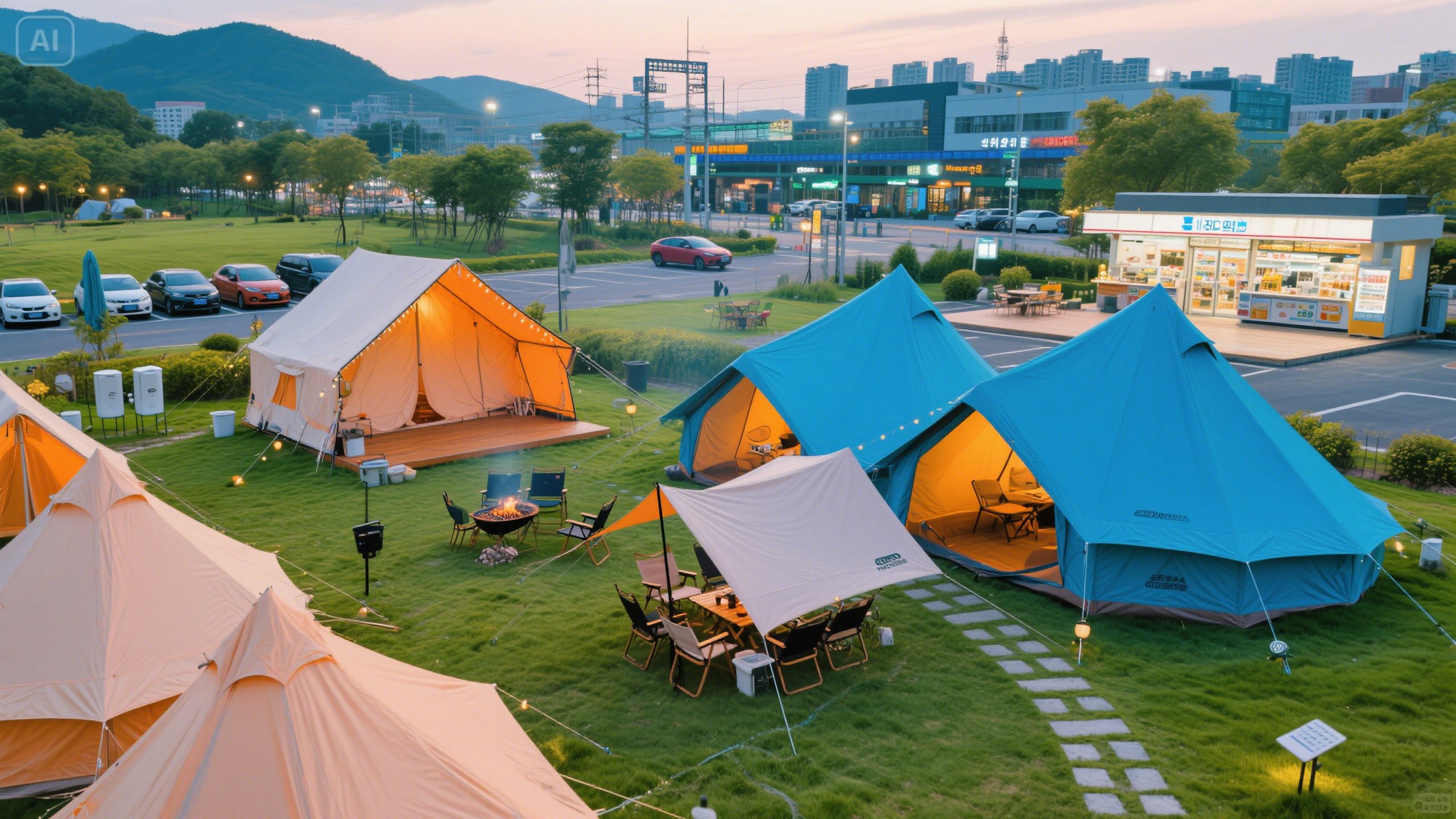 A. 도심과 가까운 곳은 마트, 편의점, 맛집이 많고, 일부 캠핑장 내 매점도 운영해요.